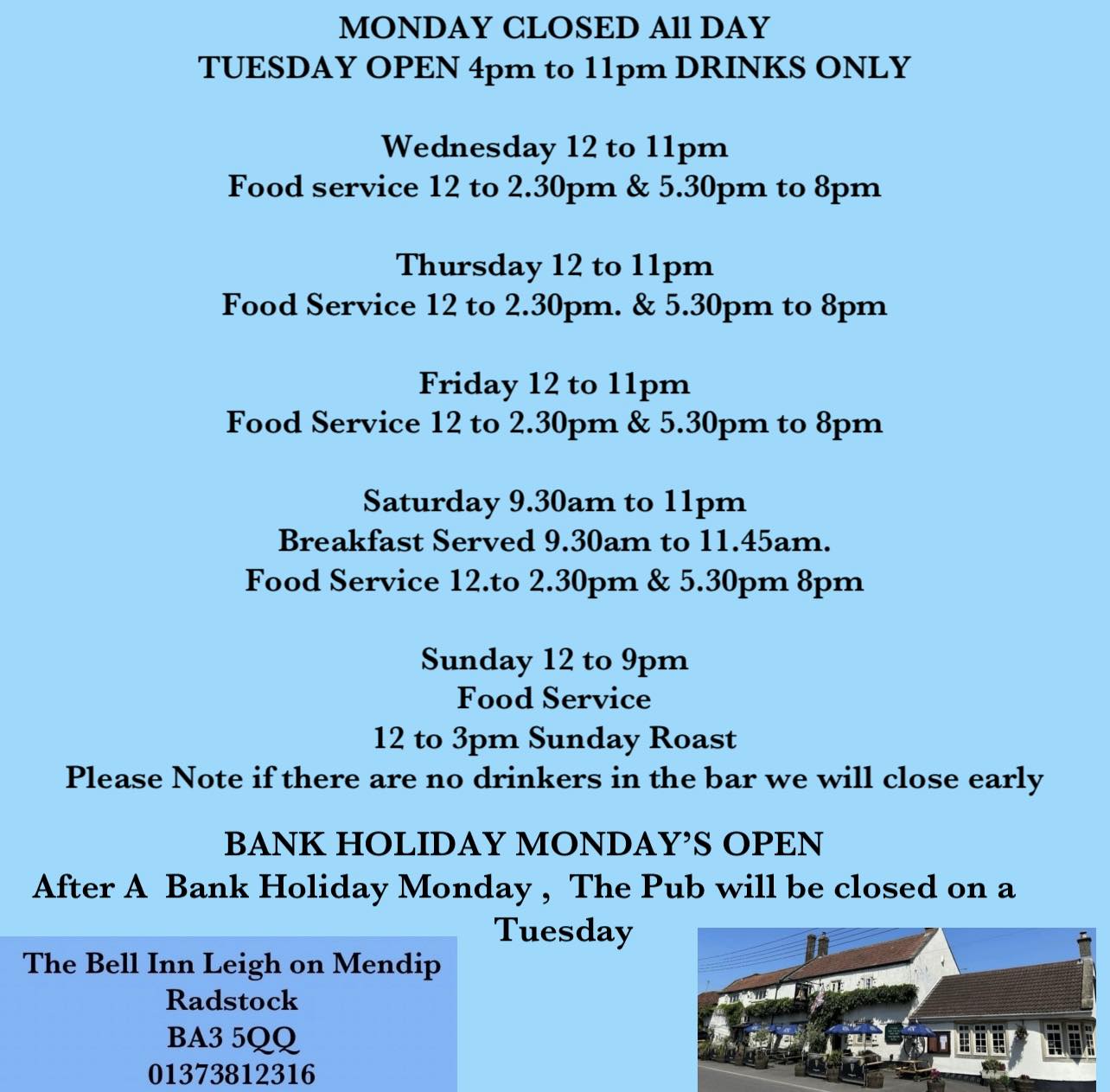 Address: The Bell Inn, Leigh Steet, Leigh on Mendip , Radstock, Somerset BA3 5QQ