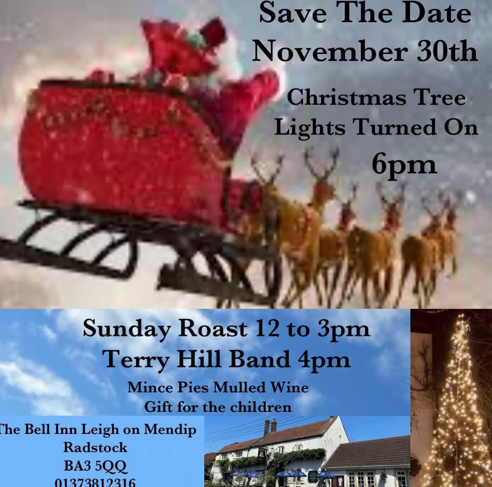 CHRISTMAS LIGHTS ON (Bell Inn) Terry Hill Band from 4:00pm, Christmas Tree Lights turned on at 6:00pm. Mince pies, mulled wine and gift for the children. Thanks John!