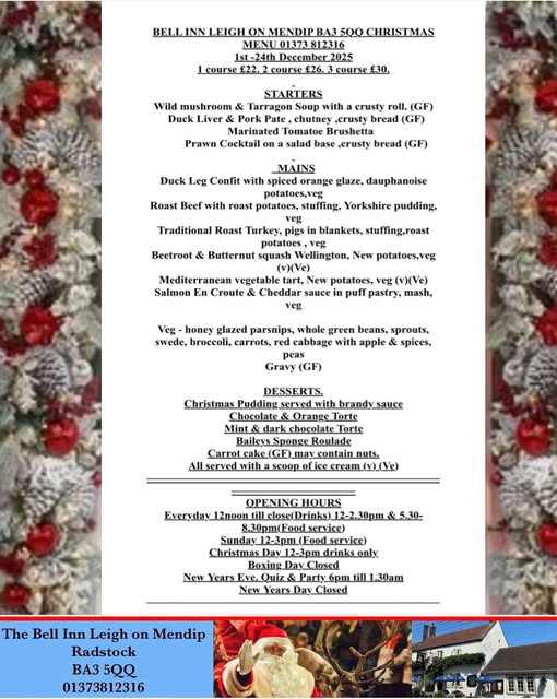 CHRISTMAS MENU (Bell Inn) click here Book early!