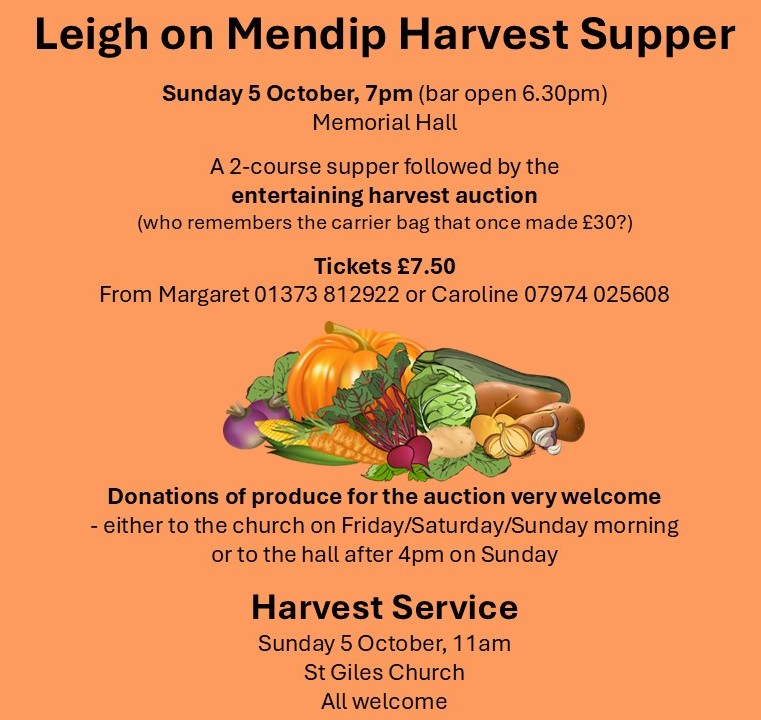 HARVEST SUPPER & AUCTION (Memorial Hall) 7:00pm, bar from 6:30 A two-course supper followed by the entertaining harvest auction (who remembers the carrier bag that once made £30? or the giant jars of pickled onions!) Tickets £7.50 from Margaret (01373 8129220) or Caroline (07974 025608). Poster.