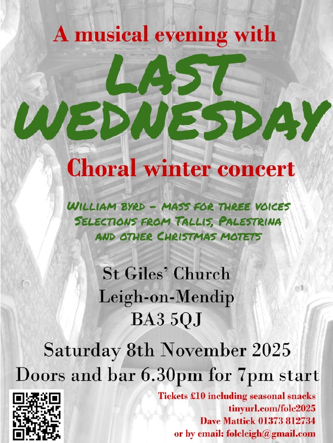 “LAST WEDNESDAY” (St Giles Church) Last Wednesday are a choral group based in London, singing a mix of early and contemporary music. The programme will take in composers from Thomas Tallis and William Byrd to John Tavener and Howard Skempton, with an emphasis on music celebrating the winter season ahead. Details of tickets are on the poster – medieval song in the medieval church, a rare opportunity!