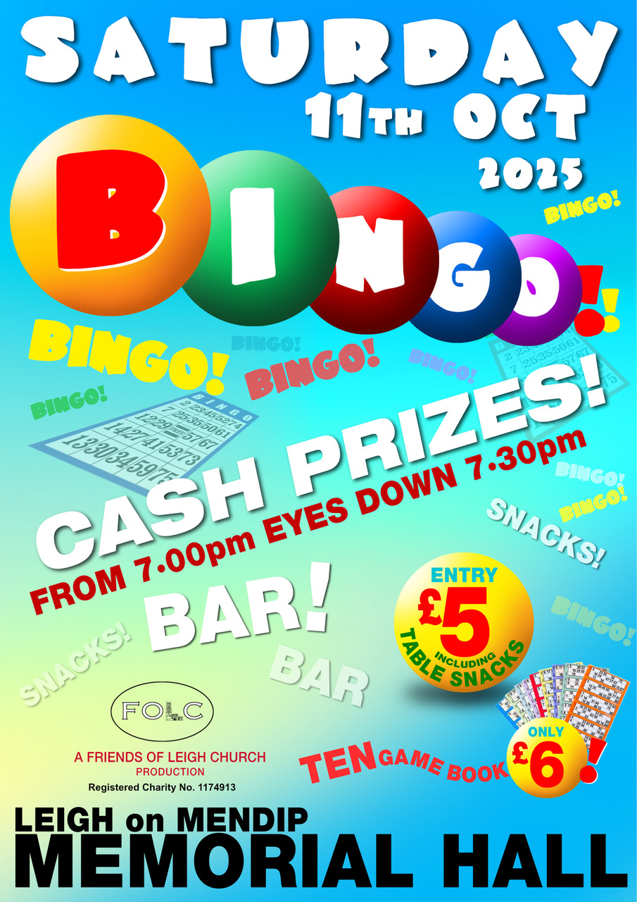 BINGO (Memorial Hall) Bar from 7:00pm, Eyes Down 7:30pm. A Friends of the Leigh Church (FOLC) event.