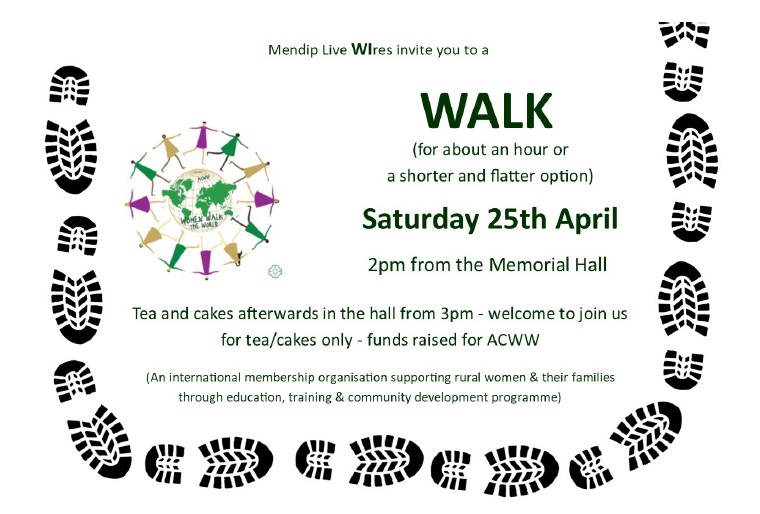 | Saturday 25th 2:00pm | ![]() WALK IN AID OF ACWW (Associated Country Women of the World). Start from the Memorial Hall. All are welcome to join us. Donations to this fund will support all of ACWW’s work, from projects to advocacy to education and awareness-raising. Click for further details. |